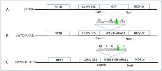 Both WT and mutated (M2033) chickpea AHAS1 genes were synthetically synthesized (Hylab laboratory, Israel) and 2002 bp DNA fragment was subcloned into BamHI–NotI sites of pNOGA, a pBIN19 derivative containing a green fluorescent protein (GFP) (Figure 8A). This gave rise to pWTCHAHAS1 and pM2033CHAHAS1 containing WT and mutated (M2033) Cicer arietinum AHAS1 genes between the CaMV 35S promoter and the nopaline synthase (NOS) terminator replacing the GFP gene, respectively (Figure 8B,C). Both pWTCHAHAS1 and pM2033CHAHAS1 plasmids were electrotransformed into Agrobacterium tumefaciens EHA101. For Nicotiana tabacum transformation, Agrobacterium harboring the pWTCHAHAS1 and pM2033CHAHAS1 plasmids were grown in 20 mL LB medium containing 100 mg mL−1 kanamycin and 100 µM acetosyringone at 26–28 °C overnight in the dark with continuous shaking at 200 rpm. A 2-mL aliquot of the overnight Agrobacterium culture was diluted in 18 mL of the same medium and grown for an additional 4–5 h to an optical density at 600 nm (OD600) of 0.5–1.0. Then the bacterial culture was centrifuged for 10 min at 160× g, room temperature, and finally diluted to OD600 = 0.5 with liquid Murashige and Skoog (MS).