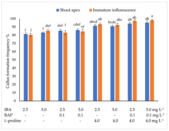 Effect of indolyl-3-butyric acid (IBA), 6-benzylaminopurine (BAP), and 4 L-proline on callus formation frequency of Miscanthus x giganteus. Treatments were performed in triplicate; statistical significance was assayed by two-way ANOVA followed by a Tukey post hoc test (p < 0.05). Data are expressed as mean ± standard error from 36 replicates.