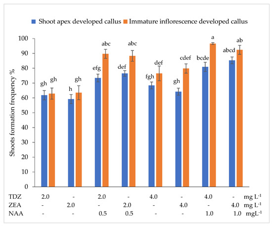 Effect of the thidiazuron (TDZ), zeatin (ZEA), and α-naphthylacetic acid (NAA) on shoots formation frequency from shoot apexes and immature inflorescences developed callus. Treatments were performed in triplicate; statistical significance was assayed by two-way ANOVA followed by a Tukey post hoc test (p < 0.05). Data are expressed as mean ± standard error from 36 replicates.