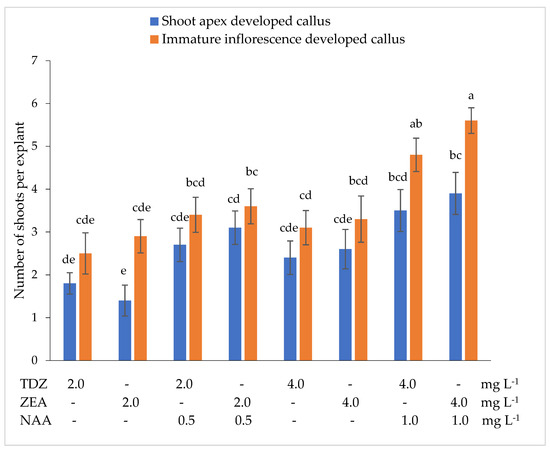Effect of the thidiazuron (TDZ), zeatin (ZEA), and α-naphthylacetic acid (NAA) on number of shoots from shoot apexes and immature inflorescences developed callus. Treatments were performed in triplicate; statistical significance was assayed by two-way ANOVA followed by a Tukey post hoc test (p < 0.05). Data are expressed as mean ± standard error from 36 replicates.