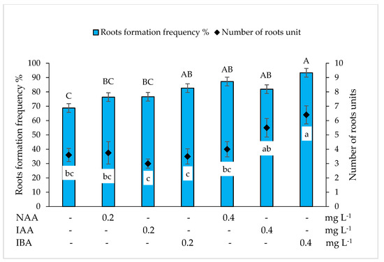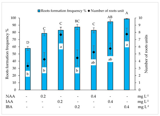 Effect of α-naphthyl acetic acid (NAA), indole-3-acetic acid (IAA) and indolyl butyric acid (IBA) on root formation frequency and number of roots Miscanthus x giganteus on WPM nutrition medium. Treatments were performed in triplicate; statistical significance was assayed by one-way ANOVA followed by a Tukey post hoc test (p < 0.05). Data are expressed as mean ± standard error from 36 replicates.