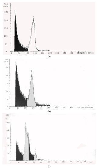 According to the scientific literature, the flow cytometry method enables the quantification of nuclear DNA [34] and the determination of ploidy [35]. Therefore, this method was applied to assess ploidy in donor plants (Figure 6a) and plant regenerants (Figure 6b,c).