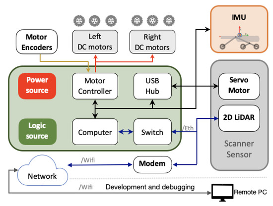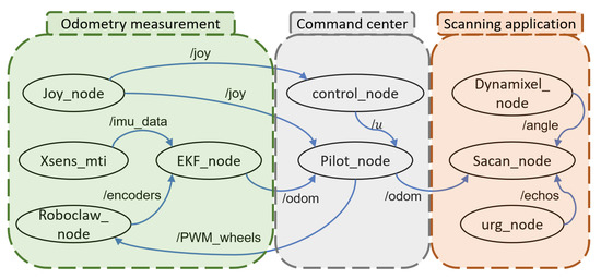 Figure 3 illustrates the computational software diagram of the system represented in ROS nodes (circles) and ROS topics (connection lines) which were developed or reconditioned from ROS programming community in C++ and Python languages. The first group of nodes corresponds with direct measurements and actions such as remote game-pad signals (Joy), Inertial Measurement Unit IMU (Xsens), Extended Kalman Filter (EKF) and motor control unit (Roboclaw). The second group of nodes contents the administration nodes which perform tasks such as remote connection with the pilot (Pilot), perception devices management, action elements management, data registration, and the synchronized data recording to generate the offline point cloud at the end of the robot’s paths (Control). The last group contents the nodes from the scan unit, composed by a servomotor (Dynamixel), the 2D LiDAR sensor (URG), and the central subsystem (Scan) to control both elements.