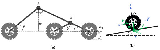 Taking into account the rocker-bogie scheme shown in Figure 2a, the suspension design begins by defining the vehicle size and the top angle of the fixed part . Furthermore, to simplify and make the design systematic, we assume the angle as rad, so therefore is determined as a hypotenuse. The segment and distance are in function of the vehicle and wheels sizes. Thus, the segment can be obtained from Equation (2). By assuming distance as the wheel diameter and can be determined as as hypotenuses in function of the and angles, respectively. Thus, is calculated as the difference between and .