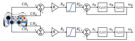 Control scheme for the speed control system. and represent the gamepad gestures; and represent the controlled wheel speed for the right side and the left side, respectively.