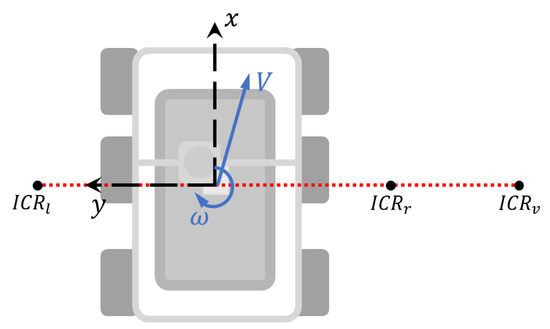 The skid-steer topology is based on Instantaneous Centers of Rotation ICR parameters. The is the point where the vehicle’s rotation takes place without translation movement. The and are the traction points representation on the local frame for the right and left sets of wheel, respectively [23]. Figure 5 shows our local reference framework and the position of each ICR point, which are necessary to describe the movement of the vehicle.