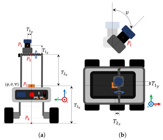 The last transformation matrix contents the rover movement information. The matrices and include the estimated motion information of the robot on its X and Y axes in the absolute frame with respect to the point by using an EKF based on the work in [27].