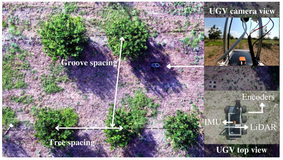 The system was evaluated on 40 citrus trees distributed along a groove of the crop, and for the reconstruction of the 3D model, from the total group, a region consisting of 24 plants was selected to validate the determination of morphological parameters in each of the plants. The orchard site is located at Agrosavia Nataima Research Center, Chicoral, Tolima, Colombia (Latitude: 4°21′21.54″ N, Longitude: 54°55′40.59″ W, Altitude: 409 m above sea level). The tree to tree spacing in the row was approximately 5.0 m with 8.0 m between furrows and approximately average height of 2.5 m. Figure 8 illustrates the experimental field and the used platform among two planting lines into the crop.