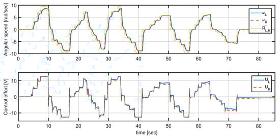 To validate the design presented in the Section 2.1.3, the vehicle was lifted off the ground to avoid external disturbance and to see the closed-loop response of angular velocity and its ability to follow a reference imposed by gamepad in the same conditions of the experiment for the model parameter estimation. The results of this experiment are presented in Figure 9.