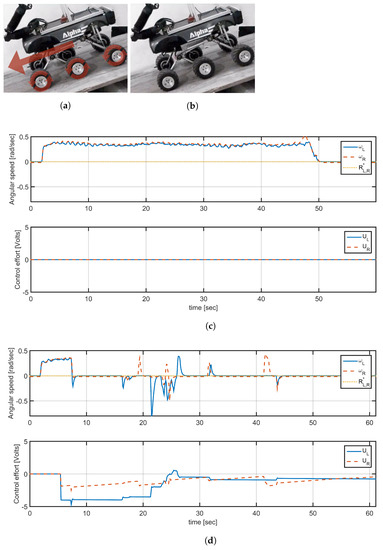 To evaluate the scope of the controller a new experiment was carried out to compare vehicle responses with and without speed control. The vehicle was placed on a flat platform with an approximate inclination of , where in open-loop condition the vehicle slides down as its weight exceeds the inertia of motors, as shown in Figure 10a. Figure 10c shows speed reference (yellow line) located at , the orange and blue curves correspond to the measured angular velocity of the motors right and left, respectively, which show an angular velocity different from zero in both cases. A new test was performed under the same circumstances, but this time with the speed control. Figure 10d shows the angular speed of the right and left wheels when implementing the wheel speed control for the same reference value. In this case, although there are some disturbances caused by noise and measurement errors in the encoders, the operation of the control is evident, as the vehicle does not slide down because the angular speeds of the wheels are following their references.