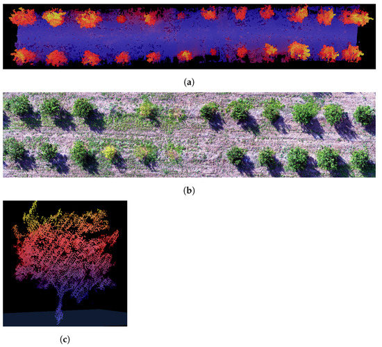 Obtained point cloud from the citrus crop segment: (a) Top view of the point cloud, (b) RGB image acquired with an aerial vehicle to compare, and (c) frontal view of a segmented tree.