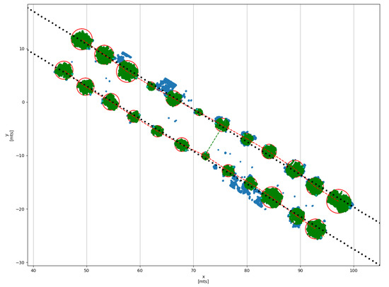 The results of the algorithm implemented on Python described in Section 2.5 are presented in Table 5. The estimation of Crop parameters begins with the uploading of the point cloud generated by the robot to the software. Next, the user selects the parameter in the graphical interface to remove the ground of point cloud and plot an understandable top view (view blue data in Figure 12). Once the scene is displayed, the user uses the mouse cursor to click in the center of each tree where a red “x” symbol appears, The user defines a circle which describes the canopy radius and forms a cylinder from the crop topmost to the point. When the click is released, a yellow “x” symbol appears and a red circle delimits the cylindrical region . When all trees in current furrow have been selected this step is repeated for a new furrow, by pressing the “” key on the keyboard to start with a new furrow and continue marking each tree. Once all the trees in all the furrows have been marked the software is able to calculate the crop parameters. The results of this process are presented in the Figure 12.