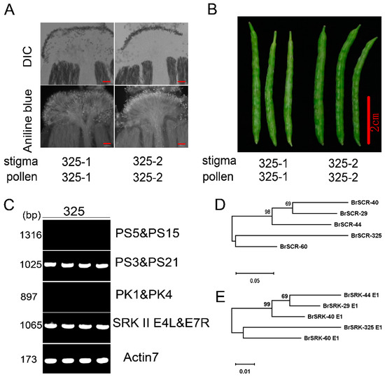 Self-compatibility phenotype identification and S haplotype determination of the inbred line ‘325’. (A) self-pollination of inbred line ‘325’ by observing with aniline blue staining, scale bar = 100 μm; (B) self-pollination of inbred line ‘325’ by observing silique development, scale bar = 2 cm; (C) S haplotype identification with class I and class II universal primer pairs, PS5 and PS15 and PK1 and PK4 were used for class I S haplotypes identification, PS3 and PS21 and SRK IIE4L and E7R were used for class II S haplotypes identification, with Actin7 as the control. (D,E) phylogenetic analysis of class II S locus genes SCR and SRK E1. An unrooted phylogenetic tree was constructed using the neighbor-joining method. Bootstrap values from 1000 replicates are shown.