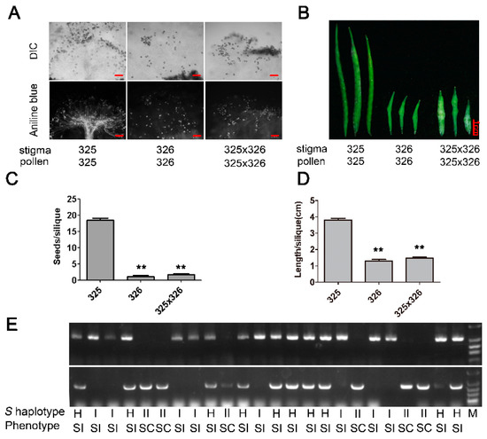 Self-pollination phenotype analysis and S haplotype identification of the segregation population derived from SC ‘325’ and SI ‘326’. (A) Aniline blue staining observing pollen germination and pollen tube growth of the self-pollinated SC line ‘325’, SI line ‘326’ and hybrid F1 coming from the SC parent ‘325’crossed with the SI parent ‘326’. Scale bar = 100 μm; (B) silique development of self-pollinated the SC line ‘325’, SI line ‘326’ and hybrid F1. Scale bar = 1 cm; (C) quantification of silique length of the SC line ‘325’, the SI line ‘326’ and the hybrid (‘326’ × ’325’) after self-pollination; (D) seeds per silique of the SC line ‘325’, the SI line ‘326’ and the hybrid (‘325’ × ’326’) after self-pollination, n = 10 siliques. Error bars indicate SE. The significance was analyzed by Student’s t-test (** p < 0.01); (E) S genotypes identification and SI phenotypes analysis in partial representative plants of the F2 population with class I (PK1and PK4) and class II (SRKII-E4Land &SRKII-E7R) S haplotype specific primer pairs. SC: self-compatible, SI: self-incompatible. H: class I and class II S haplotypes, I: class I S haplotype, II: class II S haplotype.
