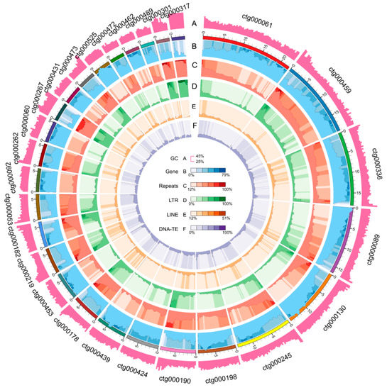 Nanopore sequencing and de novo genome assembly of the SC line’325’. Circular representation of anchored contigs of the SC line ‘325’. (A) GC content distribution.; (B) gene distribution; (C) repeat sequences distribution; (D) long terminal repeat retrotransposon (LTR) distribution; (E) long interspersed nuclear elements (LINE); (F) DNA-transposon (DNA-TE).