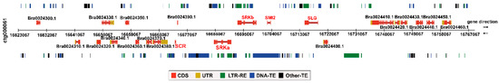 S locus organization of BrS-325. The 145 kb sequence of ctg00061 covered the whole BrS-325 locus. The red and orange boxes indicate the coding sequence (CDS) and un-translated region (UTR), respectively. The green and blue boxes indicate the long terminal repeat retrotransposon (LTR-TE) and DNA-transposon (DNA-TE) and the black box indicate the other-TE (unclassified elements).