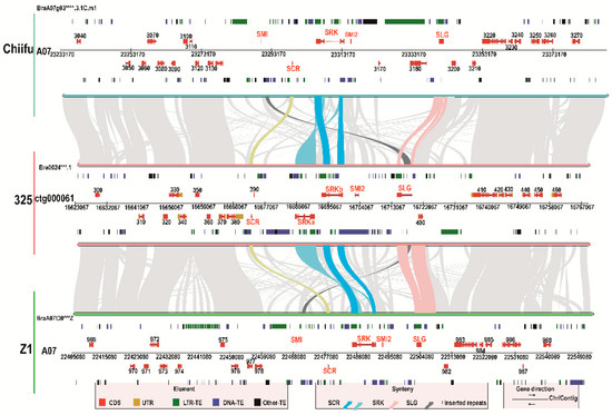 To display the synteny relationships of two class II S haplotypes, BrS-60 was obtained from the genome of ‘Chiifu’ [32] and ‘Z1’ [33], which possessed the same S haplotype and a contrasting SI phenotype, and BrS-325 was obtained from our assembled genome. Collinearity analysis of S locus sequences was performed using the software: MuMmer [103] and JCVI [104]. The S locus collinearity analysis of BrS-325 and BrS-60 was performed with the MuMmer tool. Then, visualizations of the S locus collinearity analysis were displayed using a JCVI tool.