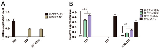 Expression analysis of the SI genes. (A) relative expression level of SCR genes in the anther. BrSCR-325 expression was detected in ‘325’ and the F1 hybrid, while BrSCR-12 expression was detected in ‘326’ and the F1 hybrid; (B) relative expression level of SRK genes in the stigma. BrSRK-325a and BrSRK-325b expressions were detected in ‘325’ and the F1 hybrid, while BrSRK-12 expression was detected in ‘326’ and the F1 hybrid. BrSRK-325 indicated that BrSRK-325a expression and BrSRK-325b expression were simultaneously detected in line ‘325’ and the F1 hybrid. Error bars represent standard errors (SE) of the mean of triplicate samples. The significance was analyzed by Student’s t-test (** p < 0.01; *** p < 0.001). The relative expression was corrected using the reference gene Actin 7.