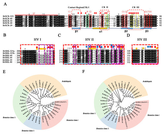As we know, the hypervariable region of SRK and contact regions were necessary for the interaction between SCRs and SRKs with the same S haplotypes [73,74,75]. Based on class II eSRKs and SCRs structure models [75], we compared the contact regions (CR I, CR II, and CR III) of class II SCRs and the hypervariable regions (HV I, HV II, and HV III) of class II SRKs (Figure 7 and Figure S4). Sequence alignment showed that some variable amino acids existed in CR II and CR III of BrSCR-325, in which the amino acid sites were identical in other known class II SCRs, including amino acid alteration (e.g., Met62, Thr75, Ser78 in BrS-325) and amino acid deletion (e.g., Pro83 in BrS-60 and Arg80 in BrS-44).