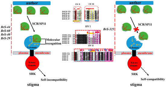 Several SC mutation materials were collected, and the results showed that changing the S locus genes, SRK, and/or SCR, leads to SI phenotype transition [27,38,39,40,42]. One SCR gene (BrSCR-325) and two duplicated SRK genes (BrSRK-325a and BrSRK-325b) exist in the BrS-325 locus; however, expression analysis results showed that the expression of BrSCR-325 and BrSRK-325b are normal, which may not be responsible for the SC phenotype (Figure 6). Recently, studies with a SCR and SRK structural basis have helped us to understand the specific recognition response in Brassica [74,75]. The specific recognition of SCR and SRK is mediated through three hypervariable regions (HV I, HV II, HV III) of eSRK and contact regions (CR I, CR II, CR III) of SCR, which predominantly contribute to ΔG for their corresponding eSRK. The specific binding induces eSRK homo-dimerization, forming a 2:2 eSRK:SCR hetero-tetramer [74,75]. Referring to the known SRK and SCR structure [74,75], we aligned the class II SRK and SCR amino acid sequences, and especially focused on the hypervariable regions of SRKs and contact regions of SCRs. The results showed that a number of amino acid variations presented in the HV I and HV II of BrSRK-325 compared to other class II SRKs (Figure 7B–D and Figure S4), which may influence the interaction between BrSRK-325 and BrSCR-325. Sequence alignment of the class II SCRs showed that some amino acid variations existed in CR II and CR III of BrSCR-325, and these mutations may influence the interaction between BrSCR-325 and BrSRK-325 (Figure 7). Thus, we speculated that amino acid variations in HV I and HV II of BrSRK-325 and CR II and CR III of BrSCR-325 may destroy the interaction between the receptor and the ligand, leading to the SI phenotype change in B. rapa (Figure 8). The model showed that specific recognition would occur in the contact regions of SCRs and hypervariable regions of SRKs, and lead to self-incompatibility in known class II S haplotypes, while the amino acid variations in contact regions and hypervariable regions may destroy the specific recognition between BrSCR-325 and BrSRK-325 in BrS-325.