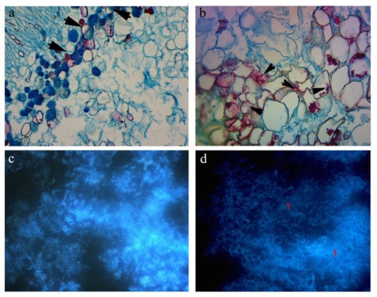 Incompatible graft unions, stained with toluidine blue, showed cell wall deflective and cells of irregular shape in the place of fusion (Figure 1a,b). Black arrows in section ‘a’ show cell wall thickening and the presence of phenolic compounds in vacuoles, while black arrows in section ‘b’ show the localization of phenols in callus samples (more intense staining of cells at the fusion part) which indicate incompatibility. The presence of phenolic compounds and their auto fluorescence ability as a response to ray absorption and the same time, the reemission of light of higher wavelength in incompatible fusions give the impression of brighter lighting versus dark field of view (Figure 1c,d). According to the review of studied fusions, the incompatibility occurs in 2.8, 3.7, 3.9, 5.8, 6.7, 6.8 and 6.9 unions.