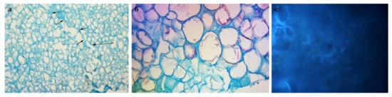 As phenolic compounds have the ability to autofluorescence, their identification and localization were performed on an epifluorescence microscope (LEICA DMSL microscope with UV filter A, excitation filter BP 340–380 nm/suppression filter LP 425 (Leica Microsystems Wetzlar GmbH, Vienna, Austria). Temporary samples for fluorescence microscopy were cut with a cryotome (Kryostat microtome/drehbares/halbautomatisch/ Stehend Slee MEV) after freezing. In this procedure, 30 µm thick sections were obtained (Figure 5b,c). The sections were placed on a plate and covered with a glass cover with the addition of a drop of water. The aqueous solution of callus section was examined using fluorescence microscopy (Leica manufactured DMLS upright microscope; excitation filter BP wavelength 450–490 nm).