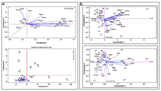 (a) The principal component analysis (PCA) projection of variables (polyphenols compounds) into a plane consisting of PCA components PC1 and PC2. The PCA component 1 represents 34.24% of the total data variability. The component PC2 represents 17.32% of the total data variability; (b) PCA projection of PC1/PC3 samples/scores plot of callus union and PC2/PC3 biplot of callus union samples. The PC3 component represent 12.09% of total data variability.