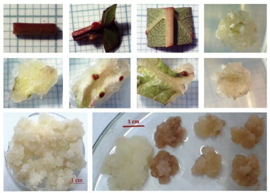In vitro explants and callus induction (in the first and second row): part of petiole, leaf base, part of lamina and axillary bud. Friable callus preparing for analysis (third row).