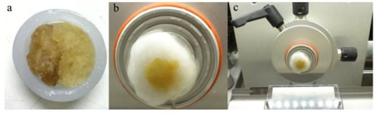 Preparation of callus union for histological analysis: (a) the fusion of two calluses in a polyethylene ring; (b,c) frozen callus union preparing for cutting process on cryotome.