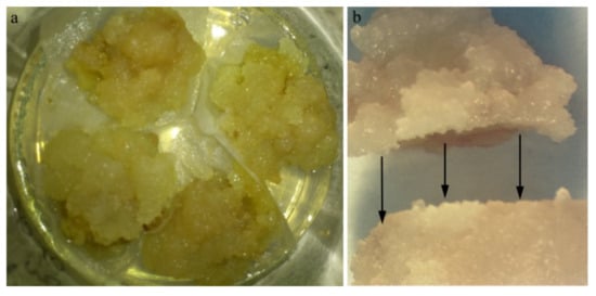 Callus fused as a homeo- or heteroplastic combination was placed on a nutrient medium according to a partially modified procedure [24]. In order to prevent possible agar adhesion to the callus sample, the permeable filter paper was placed between the agar and callus (Figure 6a). Fusion was established between callus pieces (5 mm wide) by making clean-cuts on both pieces of callus and placing one on top of the other (Figure 6b). Callus unions of all homeo- or heteroplastic tissue combinations were placed in glass jars (vessel) Ø 5.5 × 5.5 cm with 25 mL of the medium. The number of replicates was 3 × 4 samples of each scion/stock combination. The different combinations were maintained in a growth chamber at 22 ± 2 °C with a 16 h photoperiod of 17 mol m−2 s−1 provided by cool white fluorescent tubes.