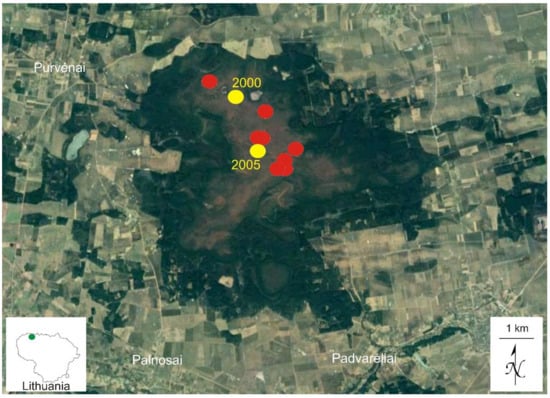Currently, 22 species of the Splachnaceae are known to occur in Europe, seven of which belong to the genus Splachnum. The rarest species, not only of this genus but also of the whole family, is S. pensylvanicum, which has been collected only three times in the East Baltic region [26,27]. Two collections come from Kaliningradskaya Oblast’ (=“Kaliningrad Province”) in Russia [28,29] and one from Latvia [30,31,32,33]. Herein, the species is recorded from Lithuania where it was discovered for the first time in 2000 in Kamanos mire, the largest peatland complex in Akmenė district, in the northern part of the country next to the border with Latvia.