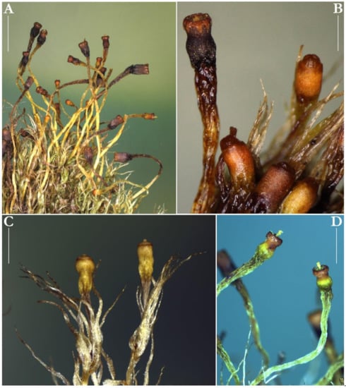 Macro photographs of Splachnum pensylvanicum taken from the specimens from Kamanos mire in Lithuania: (A) portion of dry tuft showing the plants with numerous mature sporophytes, (B) mature deoperculate capsules, (C) mature operculate capsules, (D) two deoperculate capsules with expanded columellae. All taken from KRAM B-242426 (A,B,D) and KRAM B-242425 (C). Scale bars: (A)—3 mm, (B)—0.5 mm, (C,D)—1 mm.