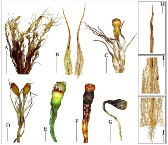 Macro and micro photographs of Splachnum pensylvanicum taken from the specimens from Kamanos mire in Lithuania: (A) portion of dry tuft showing the plants with numerous mature sporophytes and gametangia, (B) upper leaves, (C) portion of shoot with mature operculate capsule, (D) shoot with two operculate capsules, (E–G) deoperculate capsules, (H) apex of leaf subula, (I) upper cells at leaf shoulder, (J) basal cells. All taken from KRAM B-242425 (A–D; H–J) and KRAM B-242426 (E–G). Scale bars: (A)—2 cm, (B)—0.5 mm, (C)—1.5 mm, (D)—1 mm, (E–F)—0.5 mm, (G)—1.5 mm, (H–J)—100 µm.