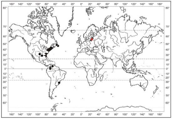 Splachnum pensylvanicum is a disjunct Euro-Eastern North American species deeply penetrating into the Neotropics where it occasionally occurs at montane elevations in Venezuela and SE Brazil (Figure 5). In Europe, the species is exceedingly rare and is currently known to occur at three localities in the East Baltic countries, including Latvia, Lithuania and the Russian Federation (Figure 6). A small population was found for the first time in 1911 by Hugo Gross in the peatland “Große Moosbruch” in the then East Prussia [47] which is a very important mire for the reconstruction of the Holocene history of the vegetation in this region [48]. Nowadays, it is situated in the Kaliningradskaya Oblast’ in the Russian Federation in an area called Bolshoe Mokhovoe Boloto (=Great Moorland). The plants collected by H. Gross were described by C. Warnstorf as a new species, Tetraplodon balticus [42], which was subsequently considered identical to S. pensylvanicum [28]. The species was rediscovered at the same mire on 11 July 1930 by Karl and Fritz Koppe [29], but it seems that it has not been rediscovered at this locality since then [49]. It has been 63 years since then, until Splachnum pensylvanicum was found again in this region, namely in the northwest of Latvia [30], and seven years later also in Lithuania. The last discovery is detailed in the present account.
