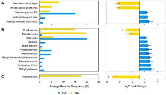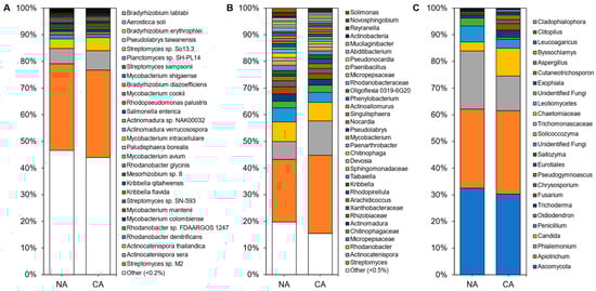 After shotgun sequence analysis, 3.5% (5/143) of the taxa were identified as differentially abundant between the NA and CA conditions (Figure 5A). After transfer to 4 °C, reads attributed to P. syringae (log2 fold change: −8.68) and R. qingshengii (log2 fold change: −8.33) decreased so that there was a change in the estimated average relative abundance of P. syringae and R. qingshengii from 8.2% and 5.0% to 0%, respectively. At the same time there was a corresponding increase in the relative abundance of Streptomyces sp. M2 (log2 fold change: 2.81), A. sera (log2 fold change: 3.20), and A. thailandica (log2 fold change: 3.87). In 16S CA samples, nine other taxa increased, including the genus Solimonas, which increased in relative abundance but was below the low abundance threshold. In total, 5.9% (11/188) of the identified sequences above the threshold were found to be differentially abundant. For the ITS analysis, the genus Phialemonium represented 5% (1/20) of the ASVs and decreased in relative abundance (log2 fold change: −10.6) (Figure 5C).