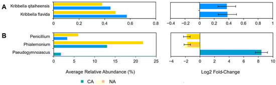 Although there were few changes in the rhizosphere community following 6 days at 4 °C, differential abundance testing using ANCOM with bias control and parsed for taxa above the assigned low relative abundance thresholds (Figure 1) identified two modestly differentially abundant species (out of 143; 1.4%) in the shotgun data. Kribbella qitaiheensis (log2 fold change: 0.37) and Kribbella flavida (log2 fold change: 0.38) increased in relative abundance after CA (Figure 2A). In addition, the relative abundance of three fungal genera (out of 25; 12%) changed following CA, including a decrease in Penicillium (log2 fold change: −1.8) and Phialemonium (log2 fold change: −1.7) and a more substantial relative increase in Pseudogymnoascus (log2 fold change: 8.43) (Figure 2B).