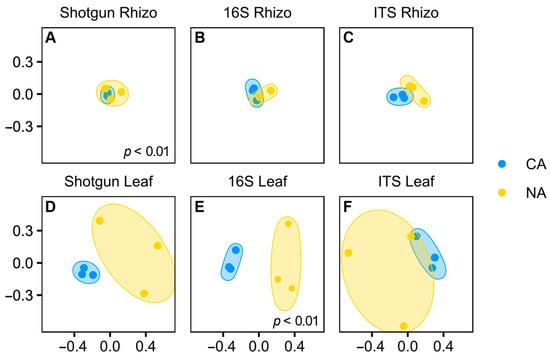 Despite the apparent community differences, Bray–Curtis dissimilarity analysis suggested that the microbial communities identified with the shotgun sequencing approach were not significantly different, undoubtedly due to the low number of sequences (Figure 3D), similar to the leaf ITS communities. Supporting that conclusion, 16S rRNA communities were shown to be significantly different between conditions (p < 0.01, pairwise PERMANOVA) with the analysis supported by high ASV numbers (Figure 3E).