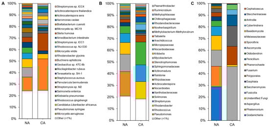 In total, 4646 microbial species were identified in the rhizosphere shotgun data with 45 ± 3% of reads remaining unclassified. The majority of identified reads, 99.70 ± 0.06%, represented bacterial microbes with 0.15 ± 0.03% and 0.13 ± 0.02% representing fungi and archaea, respectively. Alpha diversity, assessed using Shannon’s diversity index, across all rhizosphere samples was 4.98 ± 0.21 and was not significantly different between conditions with 5.07 ± 0.29 in the CA and 4.91 ± 0.94 in the NA samples. The rhizosphere was dominated by Streptomyces sp. M2, a PGPB, accounting for approximately one-third of the taxa in all samples. Rounding out the top abundant species across the rhizosphere samples were taxa present at 1–10% abundance, which included Actinocatenispora sera, Actinocatenispora thailandica, Rhodanobacter denitrificans, and Rhodanobacter sp. FDA-ARGOS 1247 (Figure 1A; Table S3). Nearly half of all species in the rhizosphere shotgun data were below a cut-off value (0.2%) for low relative abundance leaving a balance of 53% and 56% of species found in NA and CA samples, respectively.