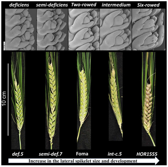 SEM of lateral spikelet development at awn primordia stage and spike form showing increase in the lateral spikelet size and development from left to right in the lines; deficiens phenotype (cv. Kristina, int-h.43, int-i39, def.5, def.6, semi-def.1, semi-def.8), semi-deficiens phenotype (semi-def.4, semi-def.5 and semi-def.7), two-rowed phenotype (cvs. Bonus, Bowman and Foma), intermedium phenotype (mutants int-a.1, int-c.5, int-e.20, int-e.4, int-f.19, int-l.81, int-m.85, HOR6211, HOR10166 and HOR6407) and Six-rowed phenotype (hex-v.3, HOR1555, HOR7191 and HOR7041).