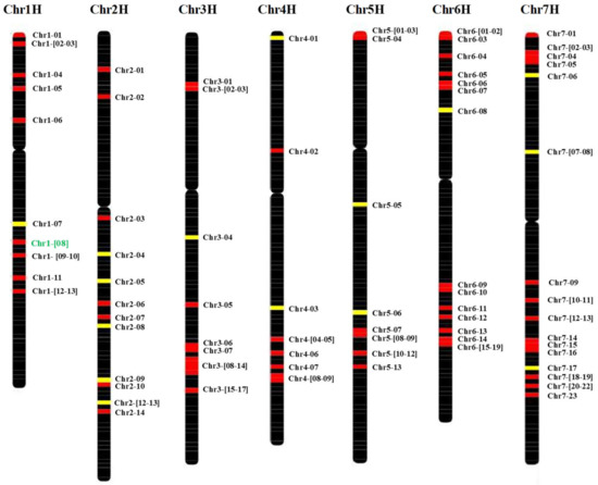 Genetic map of the HvMADS-box genes. The map includes all seven barley chromosomes. Genes are indicated to the right of each interval position. High confidence (HC) genes are marked with red, while low confidence (LC) genes are colored with yellow. HvMADS56 is in green (Chr1-08). Full name of each gene is given in Table S4.