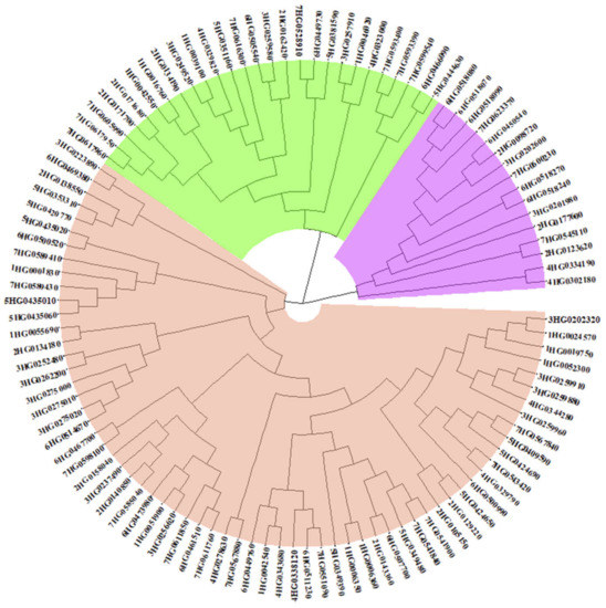 MADS-box protein sequences were isolated using the barley genome explorer (Barlex) (https://apex.ipk-gatersleben.de/apex/f?p=284:10::::::, accessed on 9 November 2021). Protein sequences (108) were isolated and annotated as the MADS-box transcription factor. A multiple sequence alignment was performed using the R-package DECIPHER [56], and then a circular phylogenetic tree was generated using the R-package ggtree [57].