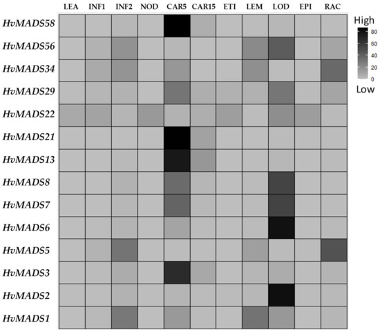 Clustering analysis of 14 HvMADS-box transcription factor gene transcripts in different barley tissues. LEA, leaves 17 days after planting (DAP); developing inflorescence 5mm (INF1, about 30 DAP); developing inflorescence 10–15mm (INF2, about 50 DAP); developing tillers (NOD), developing grain 5 days after anthesis (CAR5), developing grain 15 days after anthesis (CAR15), etiolated seedling (ETI), inflorescence lemma (LEM), inflorescence lodicule (LOD), epidermal strips (EPI), inflorescences rachis (RAC). Raw data from the https://apex.ipk-gatersleben.de/apex/f?p=284:10 website (accessed on 9 November 2021).