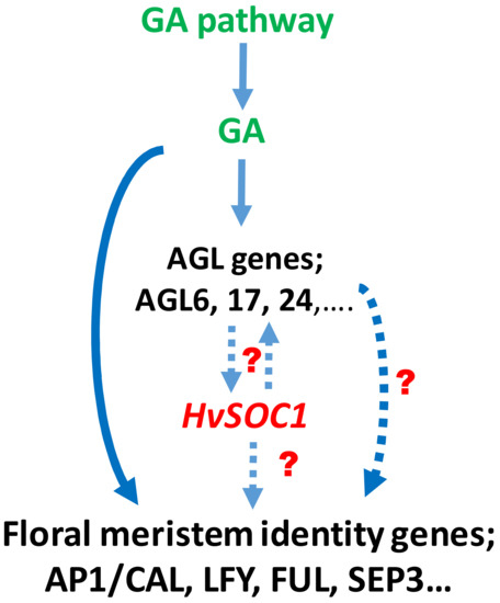 HvMADS56, which is located on barley chromosome 1H, is very similar to the putative ortholog in rice (OsMADS56, on chromosome 10) and putative ortholog in Brachypodium (Bradi3g32090, on chromosome 3) [34,35,36] composed seven exons and six introns [32]. The annotation result of these genes showed that they contain the characteristic K-domain and belong to the MADS-box (type II) family [37]. Blasting the DNA and protein sequences of HvMADS56 to the NCBI database (https://blast.ncbi.nlm.nih.gov/Blast.cgi, accessed on 9 November 2021) revealed that, HvMADS56 is similar to Arabidopsis SUPPRESSOR OF OVEREXPRESSION OF CONSTANS (SOC1) gene. Our in silico analysis showed that a maximum expression of HvMADS56 (HvSOC1) was in inflorescence development organs INF2, LEM, LOD, PAL and RAC. These expression results were in agreement with what was found in Arabidopsis [38]. Papaefthimiou et al. [39] studied HvSOC1-like1 and HvSOC1-like2 and found that both are expressed at different stages during the reproductive phase portentous their possible insinuation in seed development. This clearly suggests an important role of HvMADS56 (HvSOC1) in floret and spikelet development prior to the formation and setting of seeds. From the previous studies, SOC1 is known as a MADS-box transcription factor that is conserved and multifunctional protein in monocotyledons and dicotyledons [40,41,42,43,44,45], regulating flowering time, floral meristem patterning and determinacy [46,47,48]. It is also well known that hormones regulate floral organ patterning and spike and spikelet development in barley [10,16]. We suggest that the HvMADS56 (HvSOC1) gene is functionally acting upstream of floral meristem identity genes in barley. In Arabidopsis, Agamous-like genes such as AGL6, 17 and 24 and SOC1 interact and upregulate each other. The SOC1 gene regulates AP1, LFY, SEP3 and other flowering time genes (Figure 5). The effects of SOC1 have also been reported in other species [49,50]. We hypothesize that the activation of the floral meristem identity genes and subsequent plant flowering in barley are affected by the gibberellic acid pathway either directly or indirectly through HvSOC1 (Figure 5). This is in line with what is known about the role of SOC1 and GA in regulating flowering and inflorescence development in Arabidopsis and Orchid [49,50].