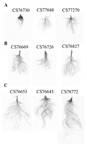 Natural variation of root growth pattern observed in Arabidopsis ecotypes. The WinRHIZO root scan images of randomly selected ecotypes with high phenotypic variation are presented. Representative images of (A) acid mine drainage (AMD)-sensitive, (B) moderately AMD-sensitive, and (C) AMD-tolerant Arabidopsis accessions are shown.