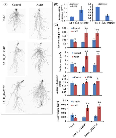 The T-DNA insertion mutant lines for miR399b (At1g63005; Salk_151454C) and DNA helicase RAD3 (At2g05635; Salk_074272C) were used to validate the role of these genes in response to AMD toxicity. Both T-DNA mutants showed increased root growth when grown on AMD versus control medium (Figure 3A). miR399b expression was induced in the T-DNA insertion line Salk_151454C (Figure 3B). We located the T-DNA insertion in the At1g63005 promoter region (Figure S6), which could enhance the miR399b expression. However, the miR399b target genes under AMD toxicity stress remain to be uncovered. The transcript abundance of DNA helicase RAD3 was significantly decreased in the Salk_074272C line, suggesting that T-DNA insertion has knocked out the DNA helicase RAD3 (Figure 3B). Furthermore, these mutants showed a significantly enhanced root growth response to AMD in cumulative root length, surface area, and root diameter. The T-DNA mutant seedlings of both miR399b and DNA helicase RAD3 showed significant tolerance to AMD toxicity. The quantitative analysis of root traits in the miR399b and DNA helicase RAD3 mutant seedlings showed 3–4 times enhanced growth in response to AMD stress compared to Col-0 (Figure 3C). These results suggest that the miR399b and DNA helicase RAD3 might have an important role in proton and AMD toxicity tolerance.