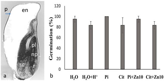Grain structure and effect of zinc on germination. (a). Structure of maize grain. (b). Germination was determined in maize embryos imbibed for 24 h in the dark at a temperature of 25 °C in double-distilled water at a pH of 6.8 (H2O), double-distilled water at a pH of 4.5 (H2O+H+), 10 mM of potassium phosphate buffer at a pH of 4.5 (Pi), 10 mM of sodium citrate buffer at a pH of 4.5 (Cit), or Pi or Cit buffer with ZnCl2 at concentrations of 1 mM (Zn1), 10 mM (Zn10). The data represent the mean ± SE of n = 40 to 60 independent data points. ANOVA was performed, followed by the Tukey–Kramer multiple comparison test, with p < 0.05 representing significance. There was no significant effect on the percentage of germination among the experimental conditions shown. Symbols: en, endosperm, np, nodal plate; p, pericarp, pl, plumule; r, radicle.