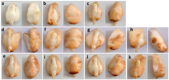 In situ location of reactive oxygen species (ROS). 3,3′-Diaminobenzidine (DAB) staining for the detection of mainly H2O2 in embryos imbibed for 24 h in different media. (a), Unstained embryo; (b), H2O at pH 6.8; (c), H2O+H+ at pH 4.5; (d), Pi; (e), Cit; (f), Pi+Zn1; (g), Pi+Zn10; (h), Pi+Zn50; (i), Cit+Zn1; (j), Cit+Zn10; and (k), Cit+Zn50.