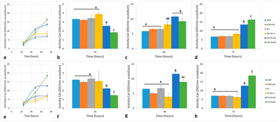 Effects of zinc on the activity of Peroxidase quantified with catechin + H2O2 as substrates (POD-Cat) from maize scutellum. Embryos were imbibed for 24 to 72 h in H2O, H2O+H+, Cit, Cit+Zn1, Cit+Zn10, Cit+Zn50, Pi, Pi+Zn1, Pi+Zn10, or Pi+Zn50. Activity was determined using catechin + H2O2 as substrates in (a): Cit or (e): Pi. Imbibition times were (b,f): 24 h; (c,g): 48 h; and (d,h): 72 h, in Cit or Pi, respectively. The data represent the mean ± SE of n = 3 to 6 independent assays. ANOVA was performed, followed by the Tukey–Kramer multiple comparison test, with p < 0.05 representing significance. Letters that are the same indicate similar variations, and the different letters indicate significant changes at each imbibition time.