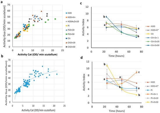 Peroxidase activity index in scutellum. (a) Relationship between the activity of POD-Cat vs. POD-Gua for the different experimental conditions during germination. (b) The dotted line indicates the regression model, which was fitted to a logarithmic relationship with the equation y = 15.933 ln (x) + 3.2831, with R² = 0.8114. (c,d) Relationship between activity index (AI) values for the activity of POD-Gua/activity of POD-Cat for each experimental condition during the germination. (c), ZnCl2 in citrate buffer; and (d), ZnCl2 in phosphate buffer. The graph shows the mean ± SE with 3 to 6 independent assays. ANOVA was performed, followed by the Tukey–Kramer multiple comparison test, with p < 0.05 representing significance. Letters that are the same indicate similar variations, and different letters indicate significant differences at each imbibition time.