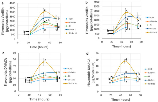 The concentration of flavonoids in the scutellum quantified with the vanillin method (Figure 2a,b) was similar to the concentration in samples germinated in H2O, H2O+H+, Cit, and Pi at 24 h. The presence of Zn1 at this time caused a slight increase of 1.16 to 1.41-fold, while Zn10 increased by 1.1 to 1.36 fold compared with the concentrations in Pi or Cit controls, respectively. Imbibition for 48 h increased the concentration of flavonoids in the controls to between 2.29 to 3.0 times the amount present at 24 h.